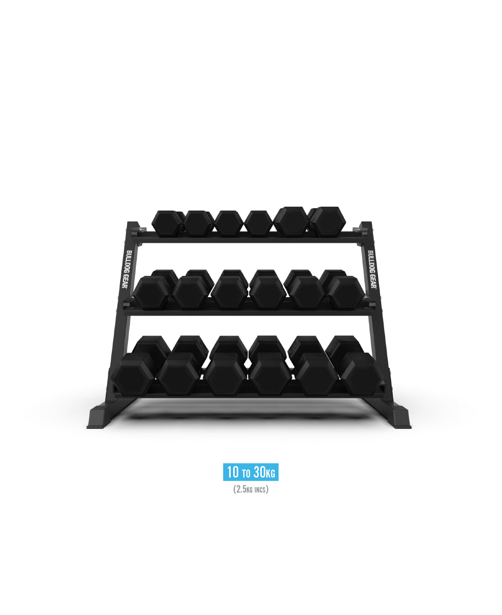 - 360kg - 10kg to 30kg Set of our Hex Dumbbell 1.0's + Rack.