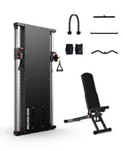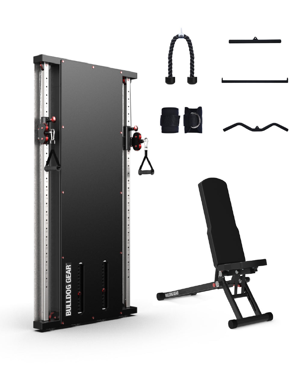 Maximise performance in minimal space with this compact, professional-grade training bundle. Designed for small space gyms, PT studios, and garage gym setups, this system combines a slimline dual adjustable cable pulley machine, a heavy-duty fold-flat bench, and a complete cable grip accessory kit.