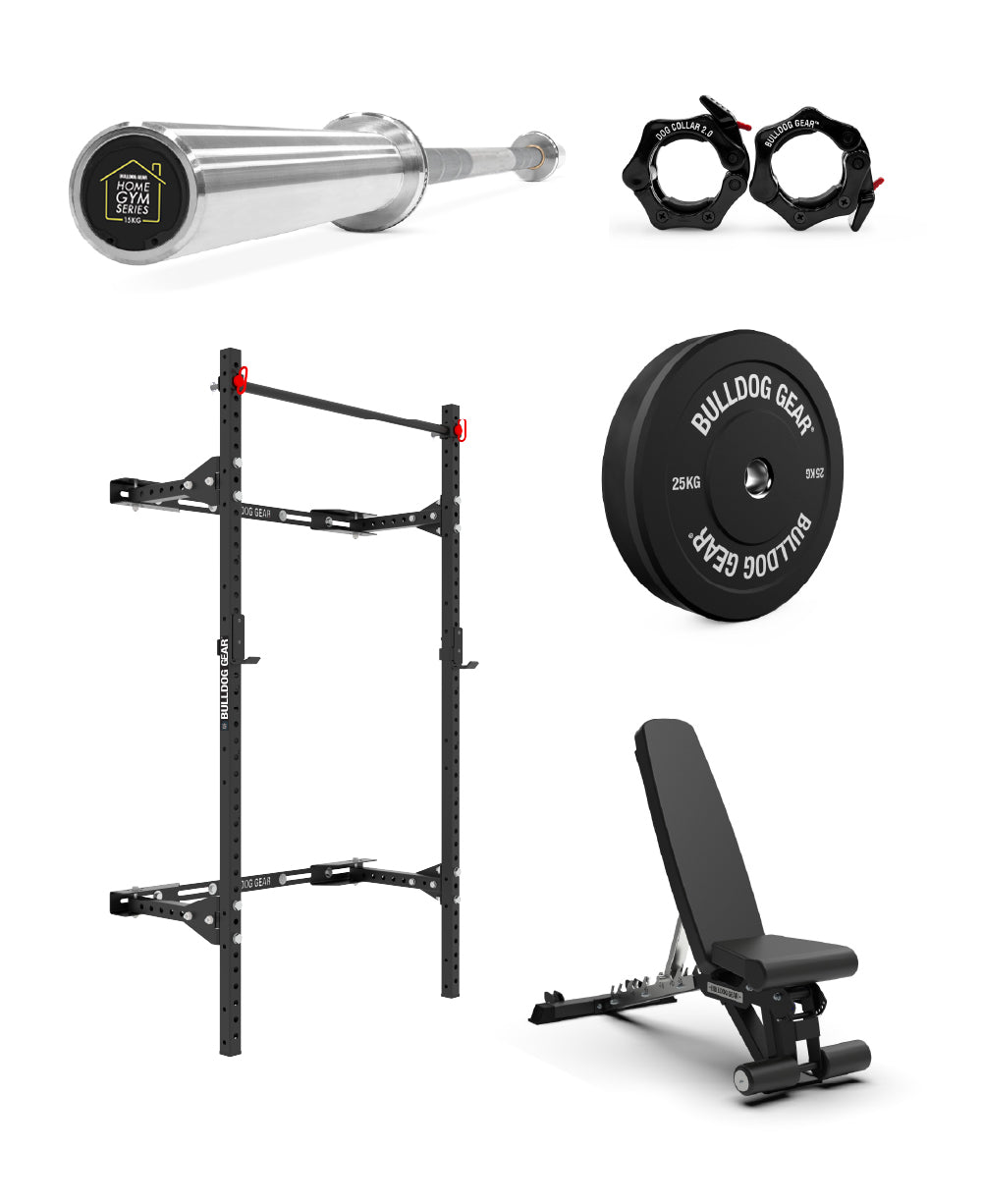 This bundle also includes a Home Gym Series Wall Mounted Folding Rack, 15kg Home Gym Barbell, a Home Gym Adjustable Weight Bench and a pair of Dog Collars - as seen on image.