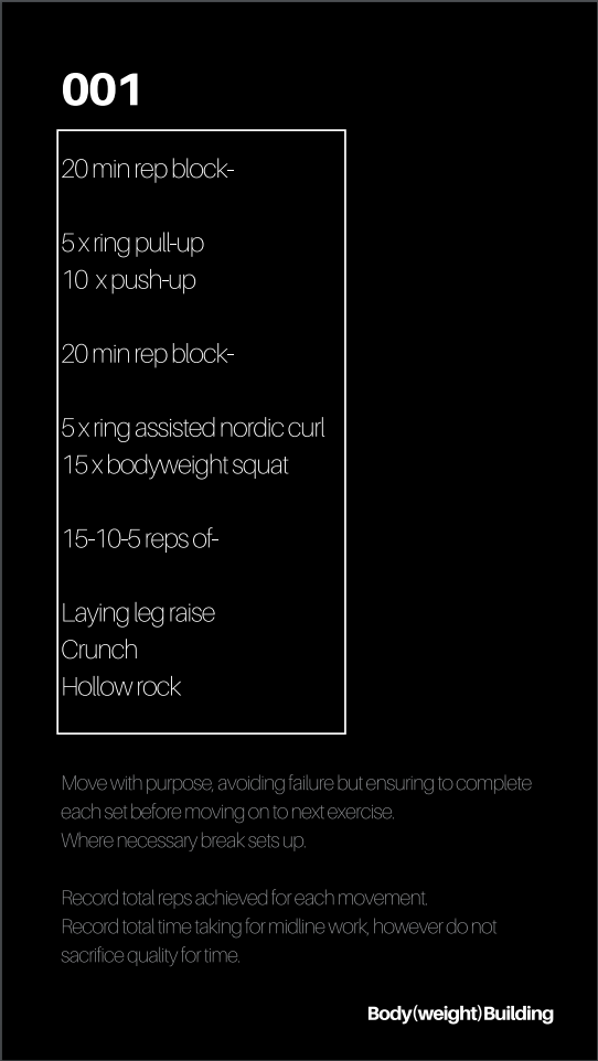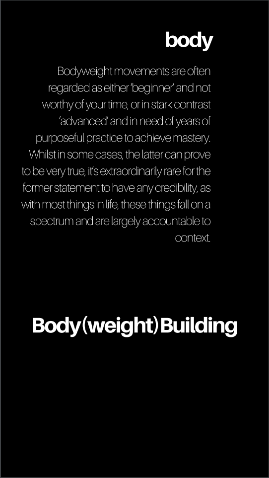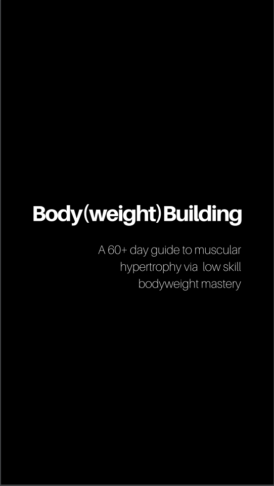 'Body(weight) Building: The Guide' is a 60+ Day guide to muscular hypertrophy via low skill bodyweight mastery