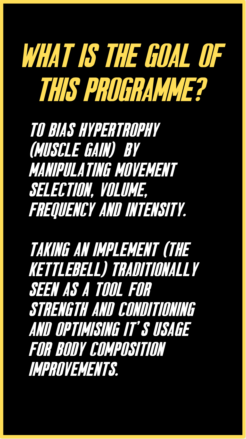 'The Kettlebell Bodybuilding Manual' is an 8-week programme designed to utilise one piece of equipment to bias hypertrophy.