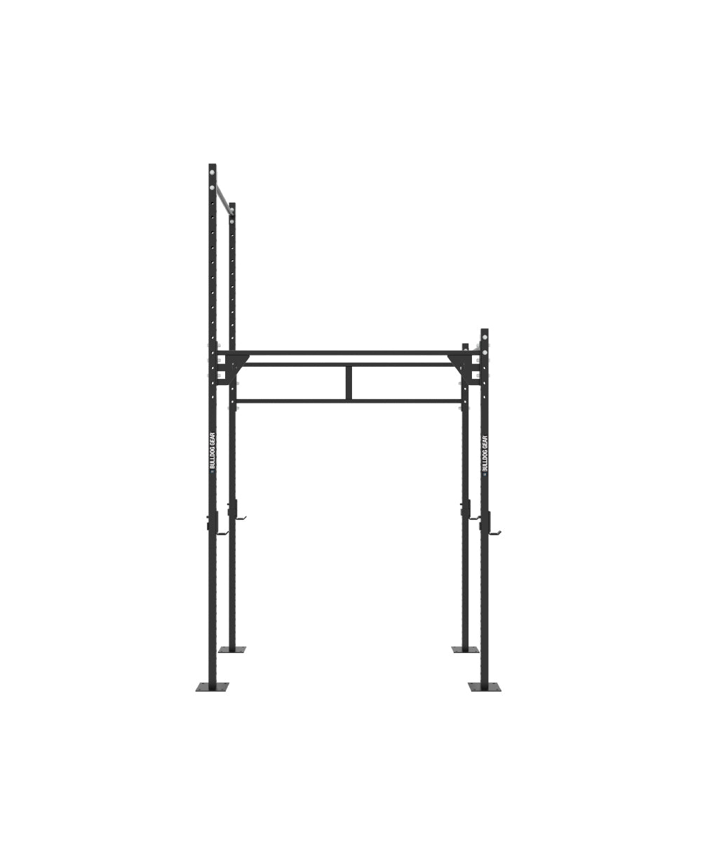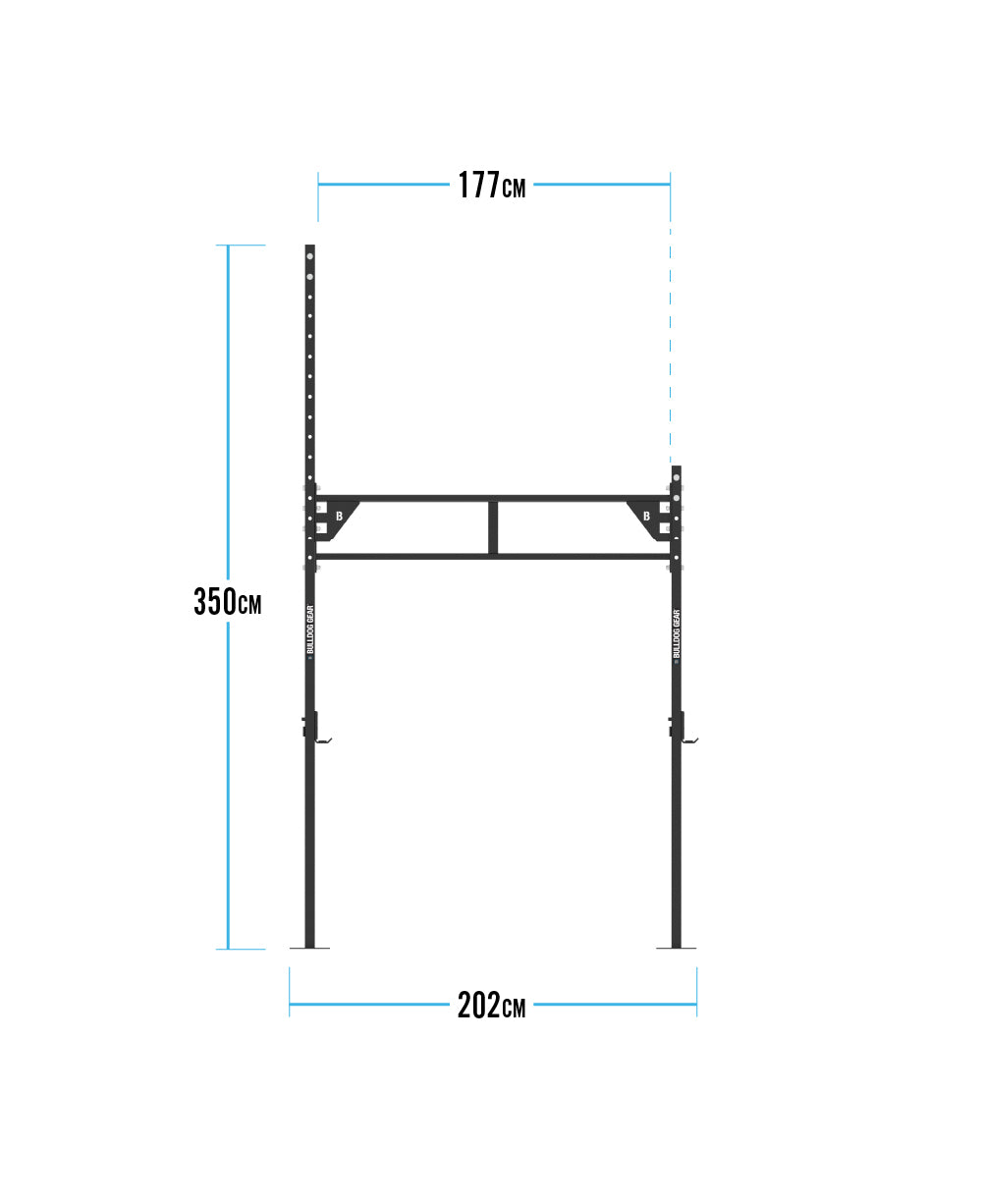 Designed and engineered from 50mm x 50mm box section the Home Gym Series Garden Rig suitable for squatting, pressing and benching, Pull ups, dips, rope climbs, ring muscle ups, bar muscle ups, toes to bar, skin the cats to name a few and have the added benefit of pull up bars which can be set at optional heights. Features 2 inbuilt racks.
