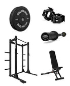 A compact, high-performance strength training bundle featuring our heavy duty MLHR Half Rack – designed for serious home gym setups and garage spaces where wall-mounting isn’t an option.