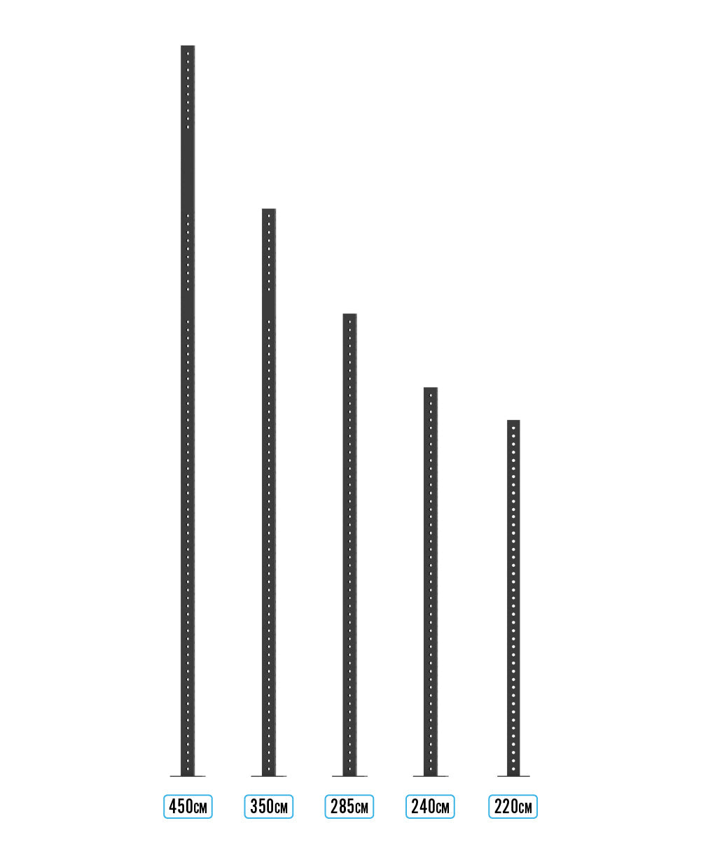 Each upright is made from 80 x 80mm box section with 18mm holes at 50mm hole spacings - great for a broad range of exercises. There are laser-cut numbers from 1 to 25 for easy identification when using Bulldog Gear J Pegs for squatting purposes. They are finished off in our custom sandpaper black powder coat - our signature finishing touch.