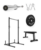 This bundle also includes a HGSSR2 - Home Gym Squat Rack 2, 15kg Home Gym Barbell, a Box Flat Weight Bench and a pair of Spring Collars - as seen on image.