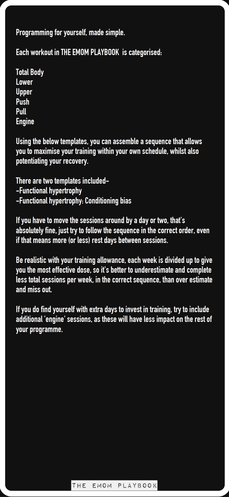 This is NOT a programme to follow, or a collection of workouts to try, this is a tool to help assemble a workout sequence that allows you to maximise your training within your own schedule, whilst also potentiating your recovery.